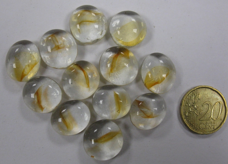 12 glasnuggets met strepen erin, zogenaamde kattenogen.