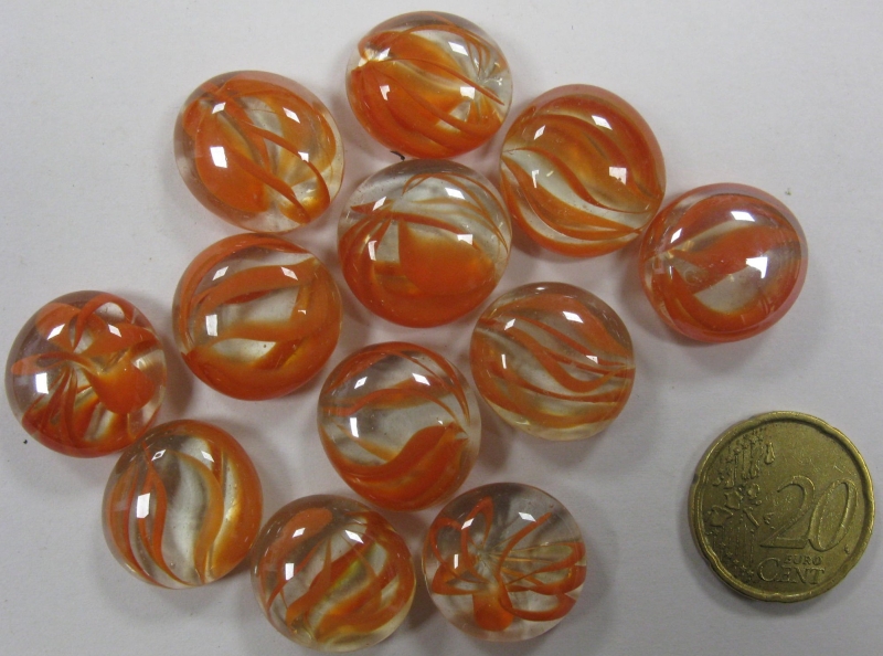 12 glasnuggets met strepen erin, zogenaamde kattenogen.