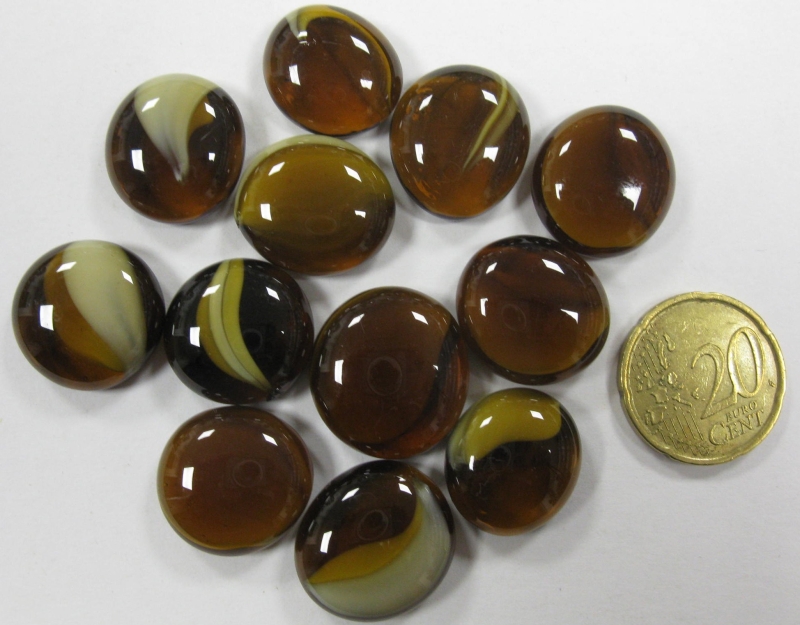 12 glasnuggets met strepen erin, zogenaamde kattenogen.
